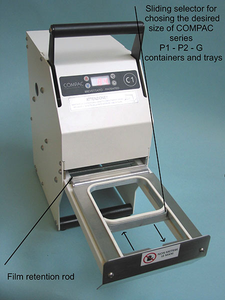 Possibility to seal 3 different formats of trays (Series P1 - P2 - G) without changing the tool, thanks to the presence of a sliding selector in the drawer.